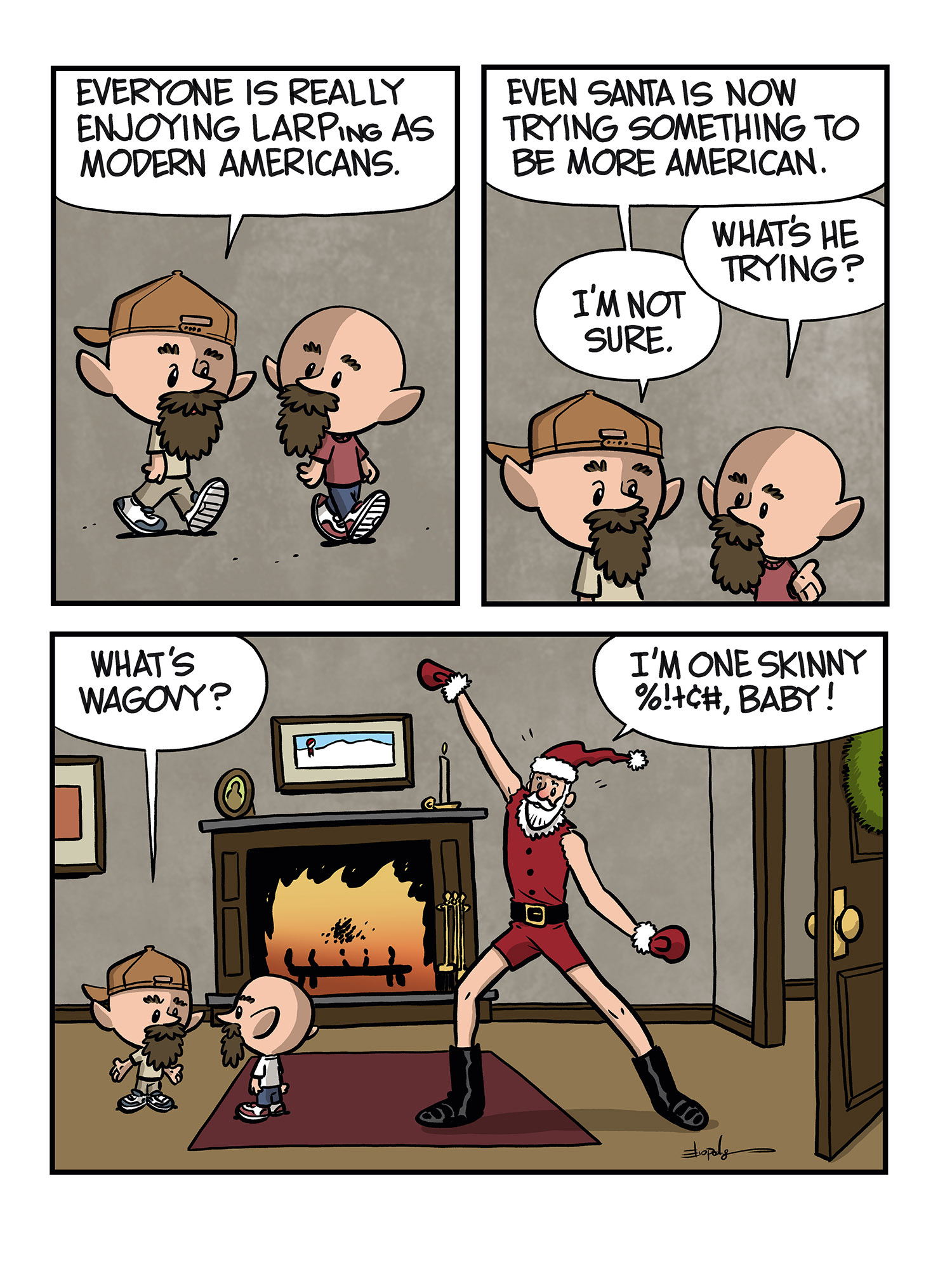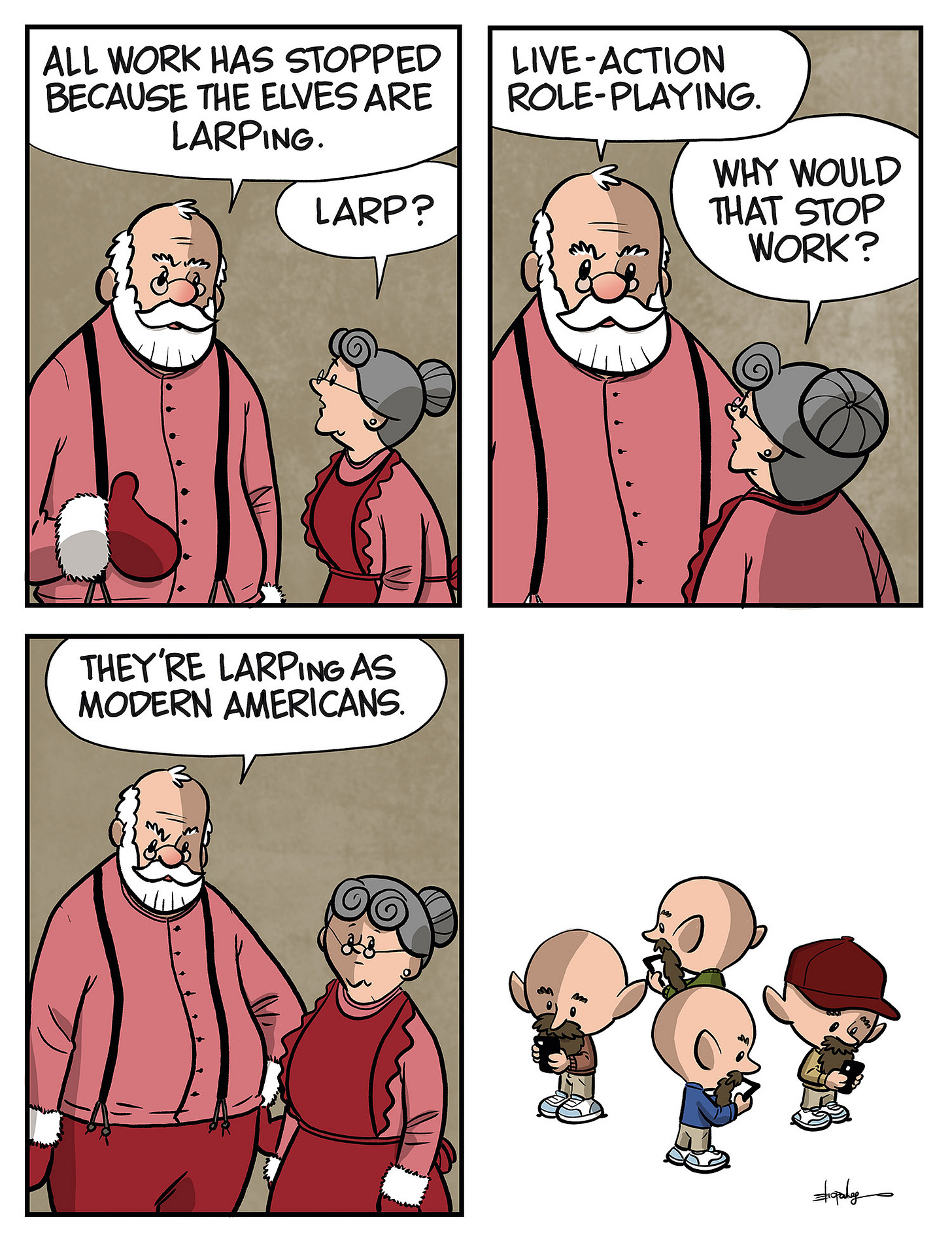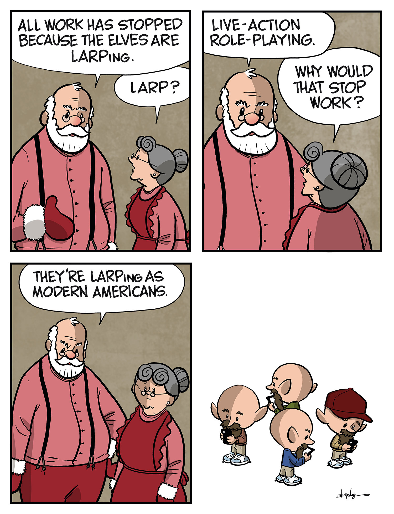 The last few years I’ve been helping out John Kovalic with some guest strips around the holidays. The first year, the main characters, Santa’s elves, played a D&D type game called Humans & Homes. Last year it was all about video games. THis year, they were LARPing as modern Americans. Now that they’ve all been posted, here they are. Hope you like.