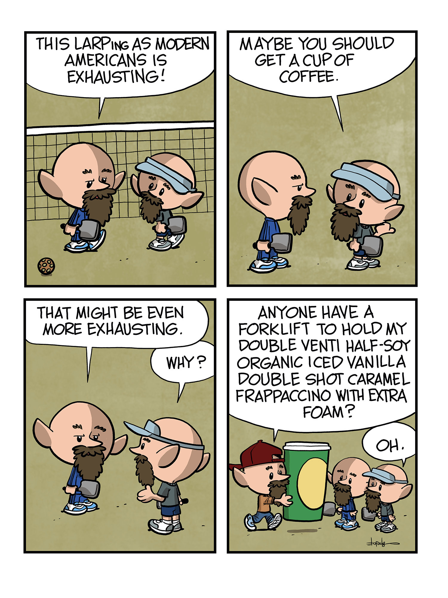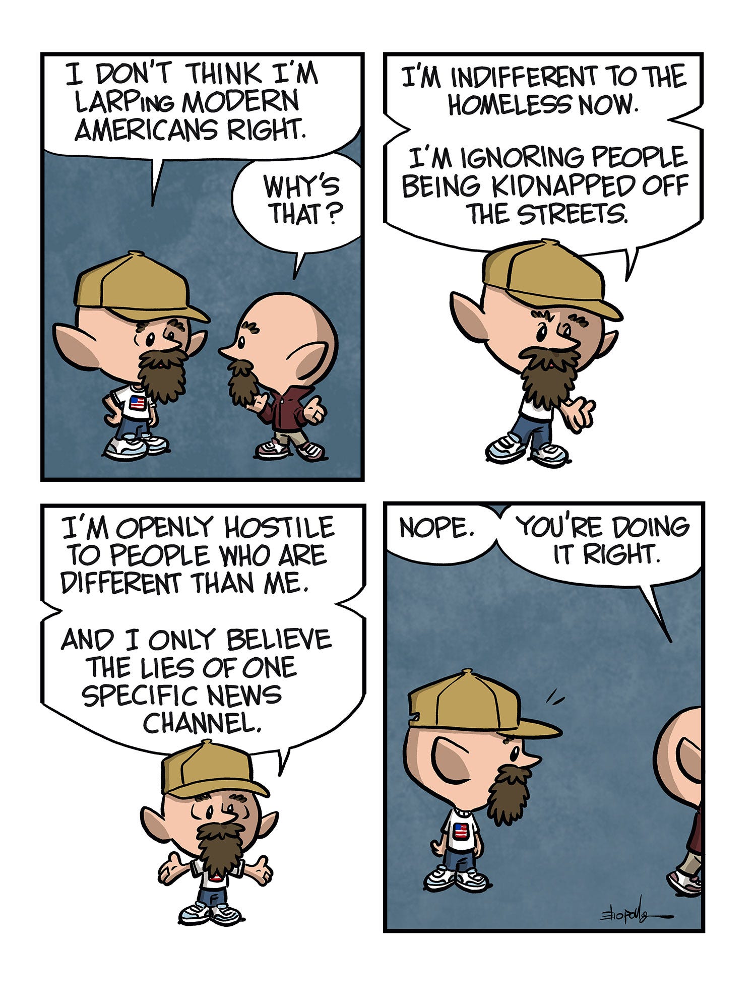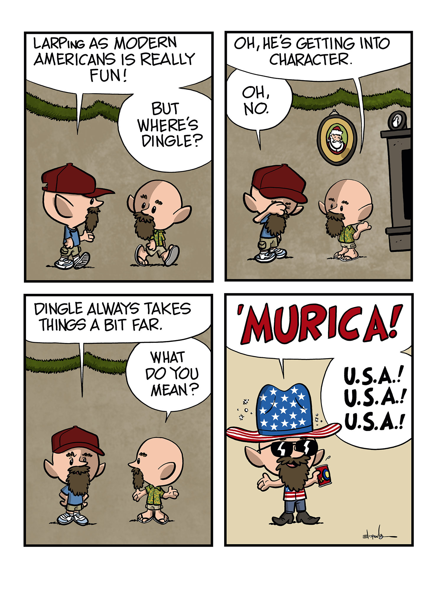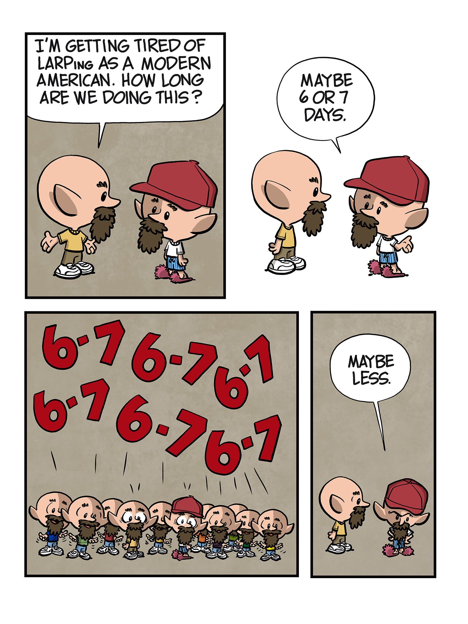 The last few years I’ve been helping out John Kovalic with some guest strips around the holidays. The first year, the main characters, Santa’s elves, played a D&D type game called Humans & Homes. Last year it was all about video games. THis year, they were LARPing as modern Americans. Now that they’ve all been posted, here they are. Hope you like.